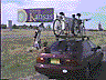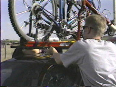 Red bike rack gets a tune up along the way. THREE bikes on a tiny roof.
